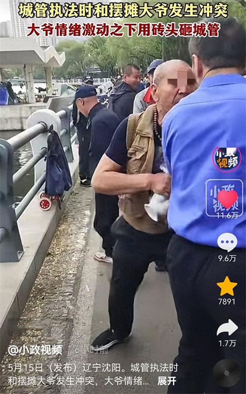 近日,在沈阳一地城管执法时与摆摊大爷发生冲突。