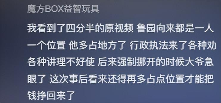 我看到了四分半的原视频,鲁园向来都是一人一个位置,他多占地方了,行政执法来了各种劝各种讲理不好使,后来强制挪开的时候大爷急眼了,这次事后看来还得再多占点位置才能把钱挣回来了。