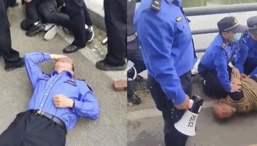 之后便可以看到一位执法人员躺在地上,一只手捂着眼睛那里,而大爷已经被其他的执法人员压制在地。