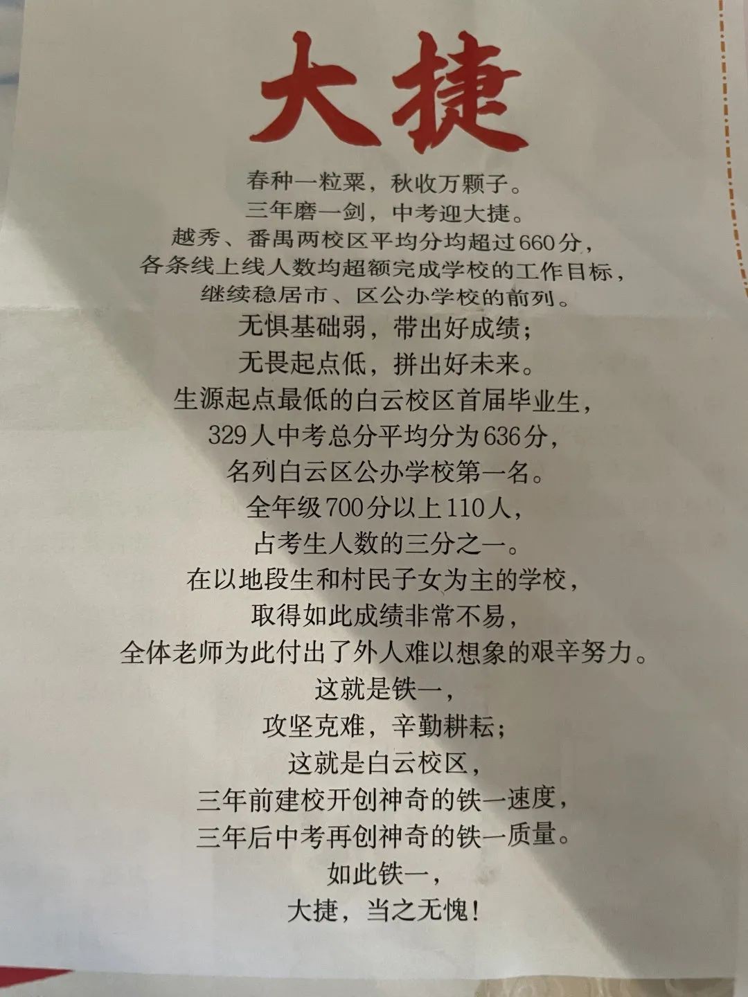 白云校区首届毕业生,329人中考总分平均分为636分,名列白云区公办学校第一名。全年级700分以上110人,占考生人数的三分之一。