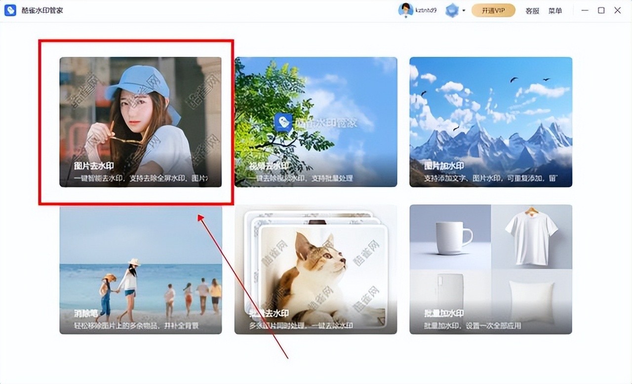 1、打开酷雀水印管家软件后,主界面会显示多种功能选项,点击“图片去水印”。