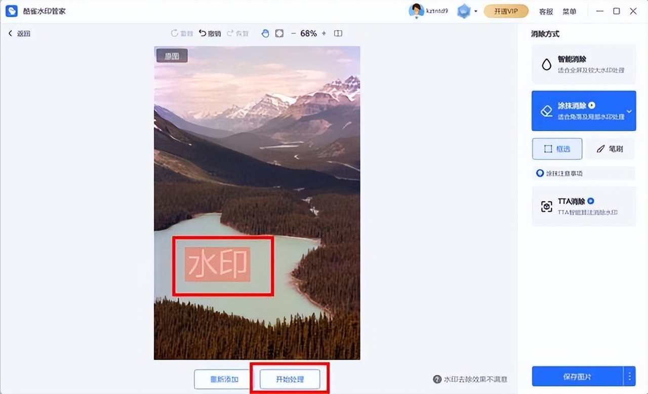 4、选择涂抹消除,使用鼠标框选图片中的水印部分,点击“开始处理”按钮。