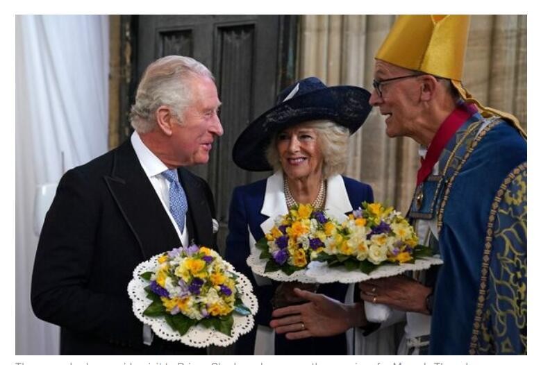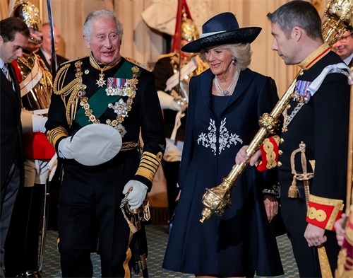 在抵达国会大厦(是个殿堂而非高楼)时,查尔斯王子穿着他全套的海军上将礼服、佩戴着所有的勋章从车里走了下来,而同行的公爵夫人卡米拉则身穿着对襟绣银色花图腾的海军蓝衣裙和同色系帽子,夫妇二人一个金灿灿如太阳,另一个银晃晃优雅如月亮。