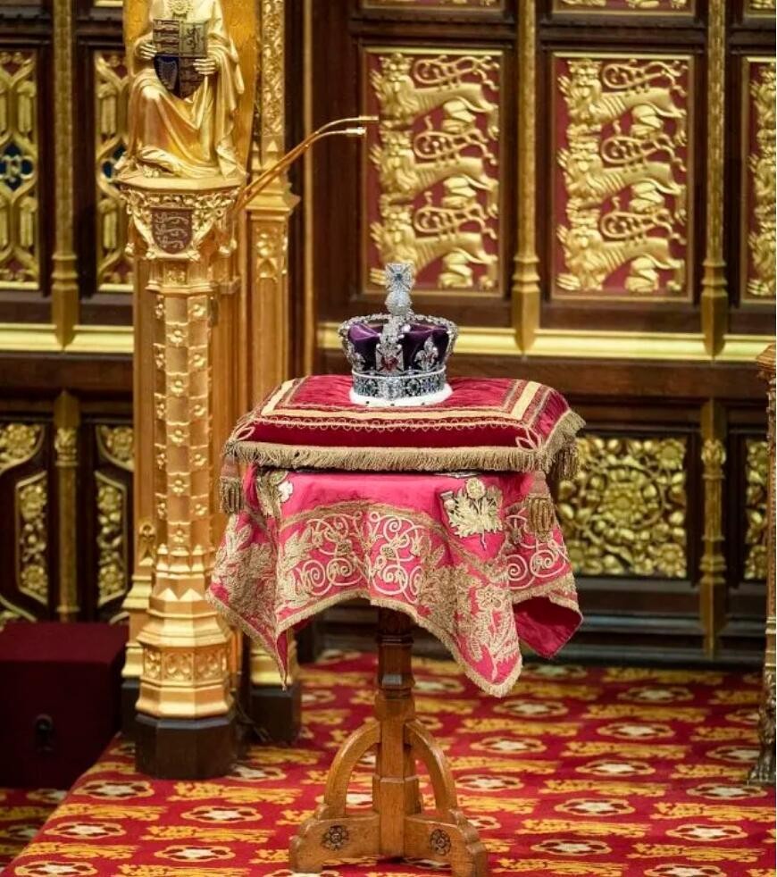 女王虽然没有出席,但是她老人家华丽的华盖之下,帝国皇冠被放在天鹅绒垫子上。