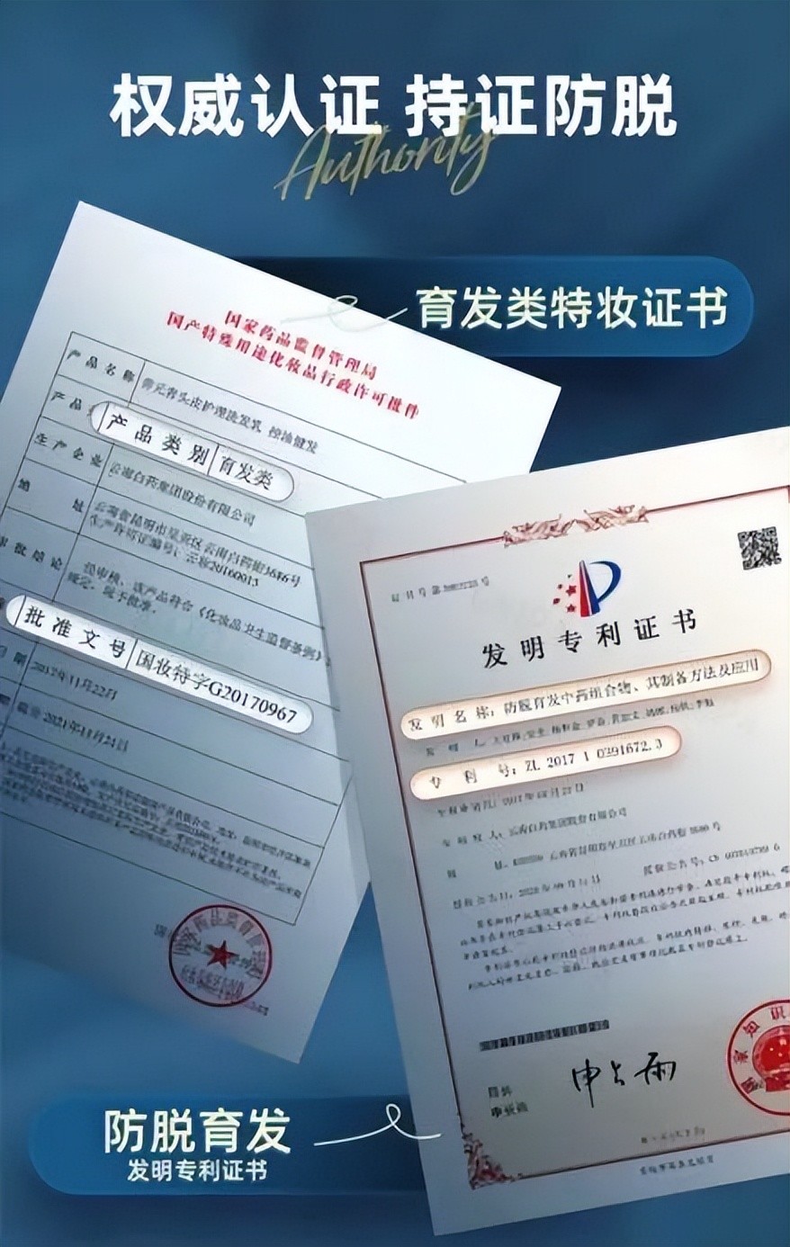 而经过多年的研发,养元青最终获得了育发类特妆证和防脱育发发明专利证书。