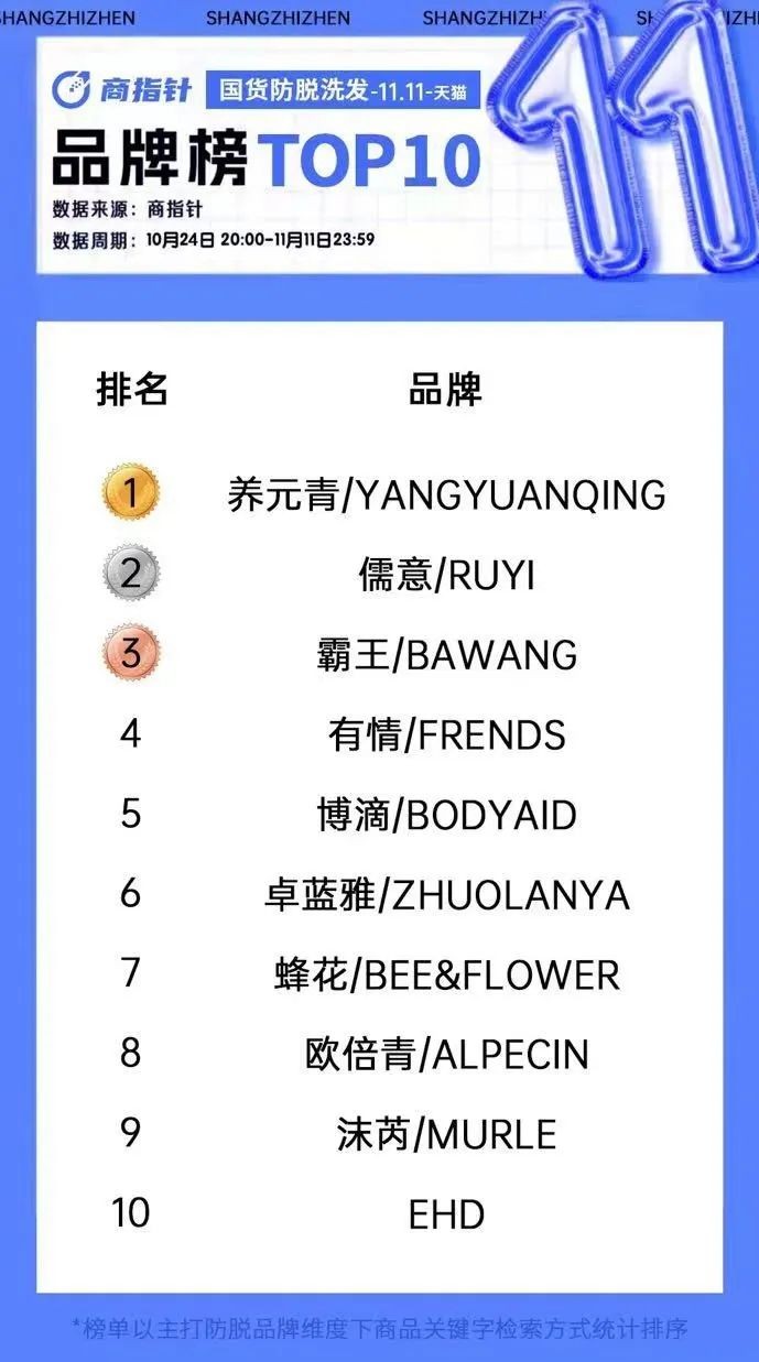 2022年天猫双11战报出炉,国货防脱洗发水第一名花落养元青。
