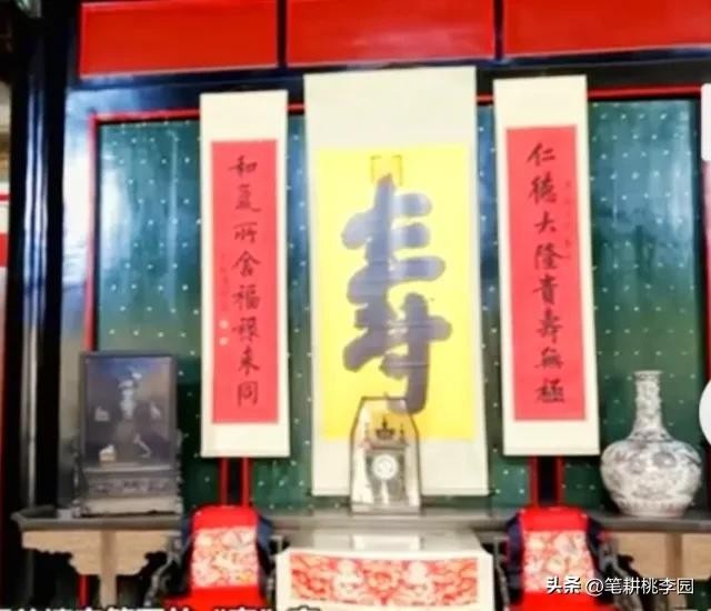 中间的“寿”字为慈禧所题。寿字左边放瓶,右边放镜,中间放镜,意为“终生平静″。