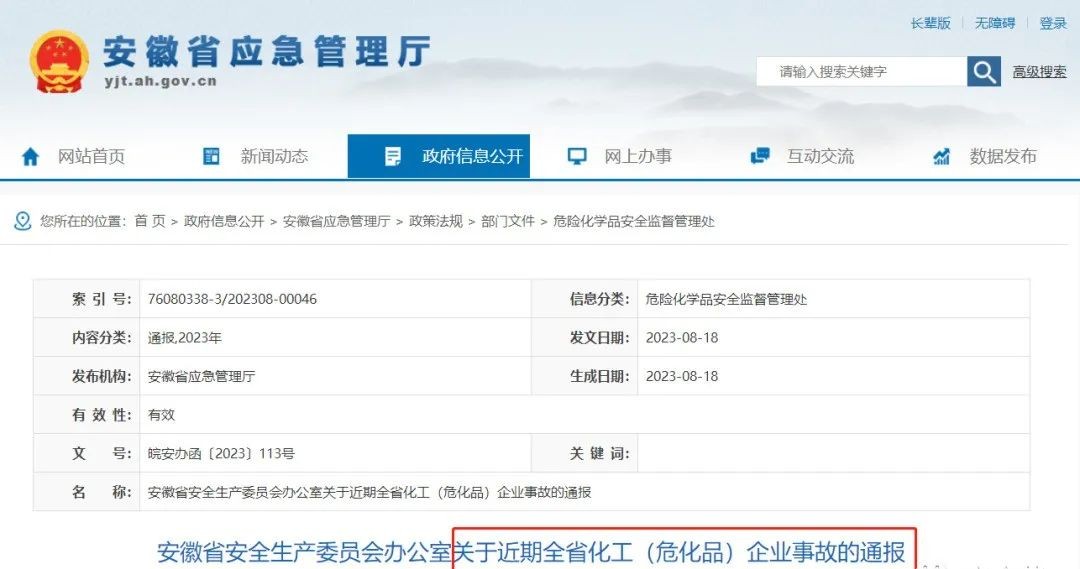 8月18日,安徽省安全生产委员会办公室发出关于近期全省化工(危化品)企业事故的通报。通报提出,各地要正确处理监管和服务的关系,在监管执法上宁可事前听“骂声”,不可事后听“哭声”,对企业严重违法违规行为要果断“亮剑”,让违法违规者付出应有的代价。