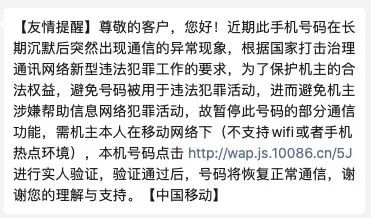 据听众介绍,停机的同时,他还收到了一条中国移动发来的短信,让他进行实人验证。