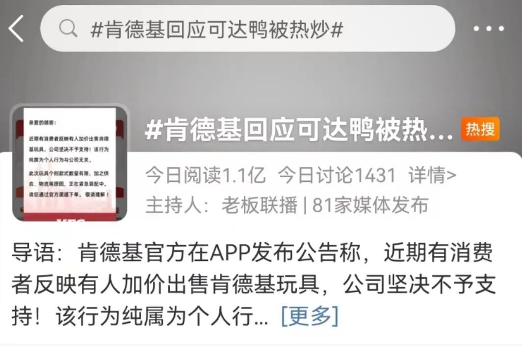 声明称,对于近期有人加价出售肯德基玩具,公司不予支持,该行为纯属为个人行为与公司无关。此次玩具个别款式数量有限,加之供应、物流等原因,正在紧急调配中。