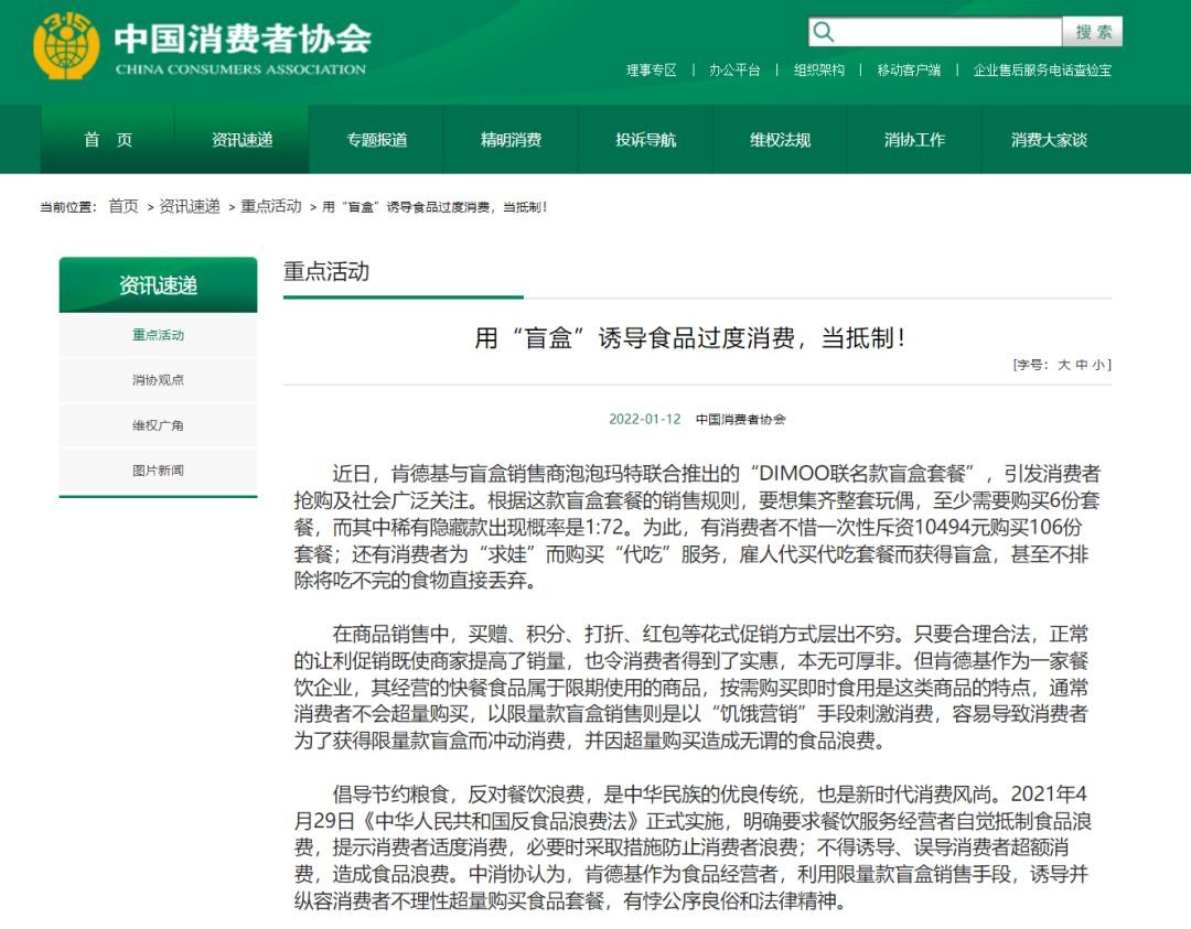 今年1月份,肯德基与泡泡玛特联名推出“DIMOO”附赠盲盒玩具被IP粉疯抢,因诱导食品过度消费被中消协点名批评。中消协在其网站发布《用“盲盒”诱导食品过度消费,当抵制!》,文章表示,以限量款盲盒销售则是以“饥饿营销”手段刺激消费,容易导致消费者为了获得限量款盲盒而冲动消费,并因超量购买造成无谓的食品浪费。