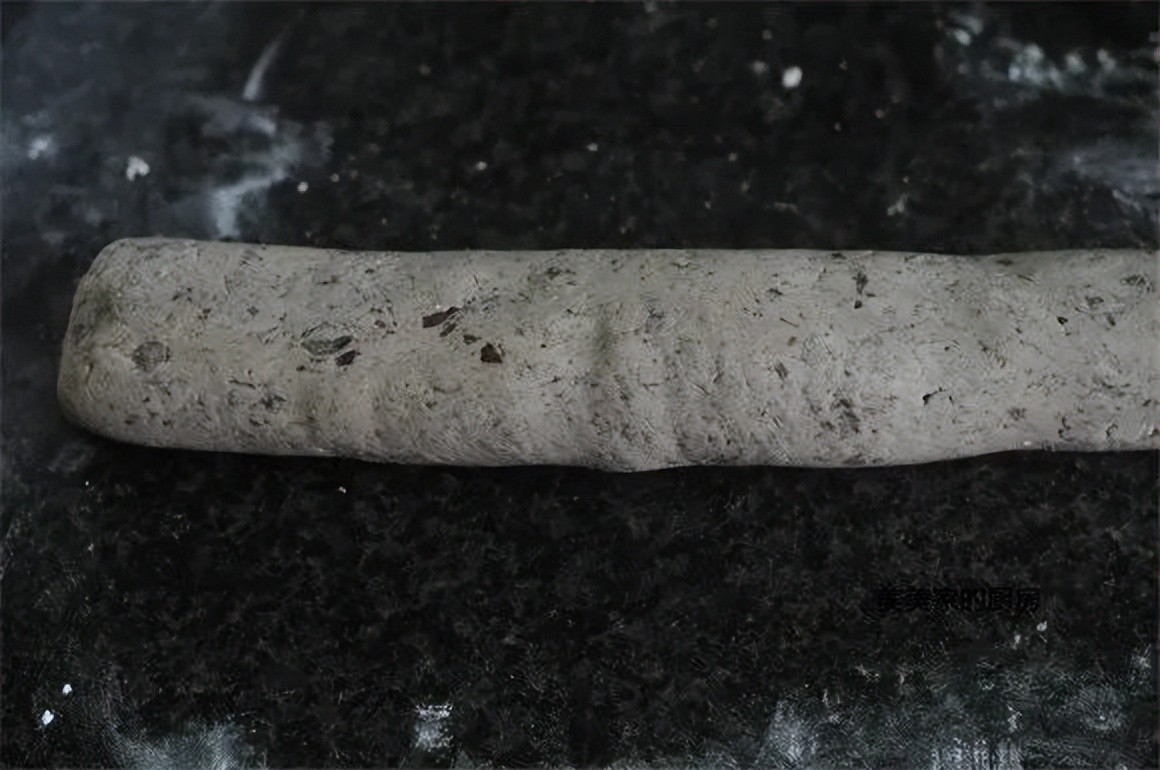 面板上撒干粉,将面团放在案板上,搓成长条。