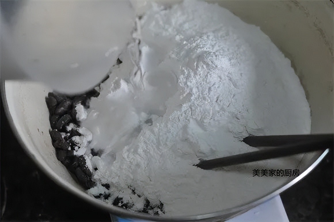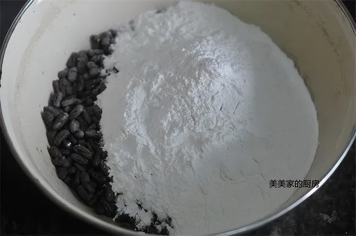 如果煮好后还有多余的水分,稍微过滤下,将红豆捞出来放在盆里,加入两种粉。