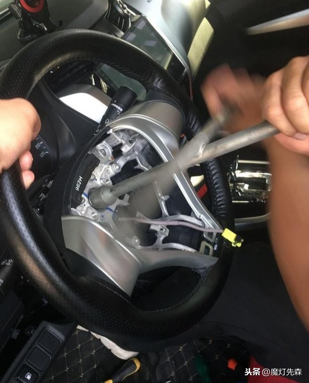 前轮打正,用19号套筒,把方向盘中间大螺丝拧出来