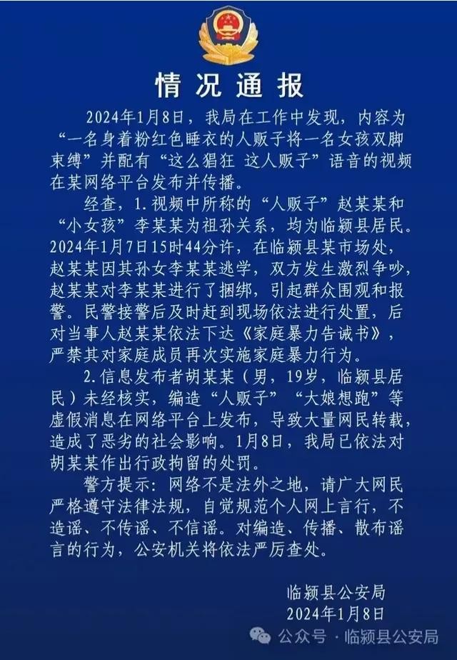 2024年1月8日,当地警方发布了一则情况通报,根据这份情况通报显示,视频中,被网友们称为“人贩子”的赵某某和被拐卖的小女孩孙某某实为祖孙关系,也就是说,那位“人贩子”实际上是小女孩的奶奶。