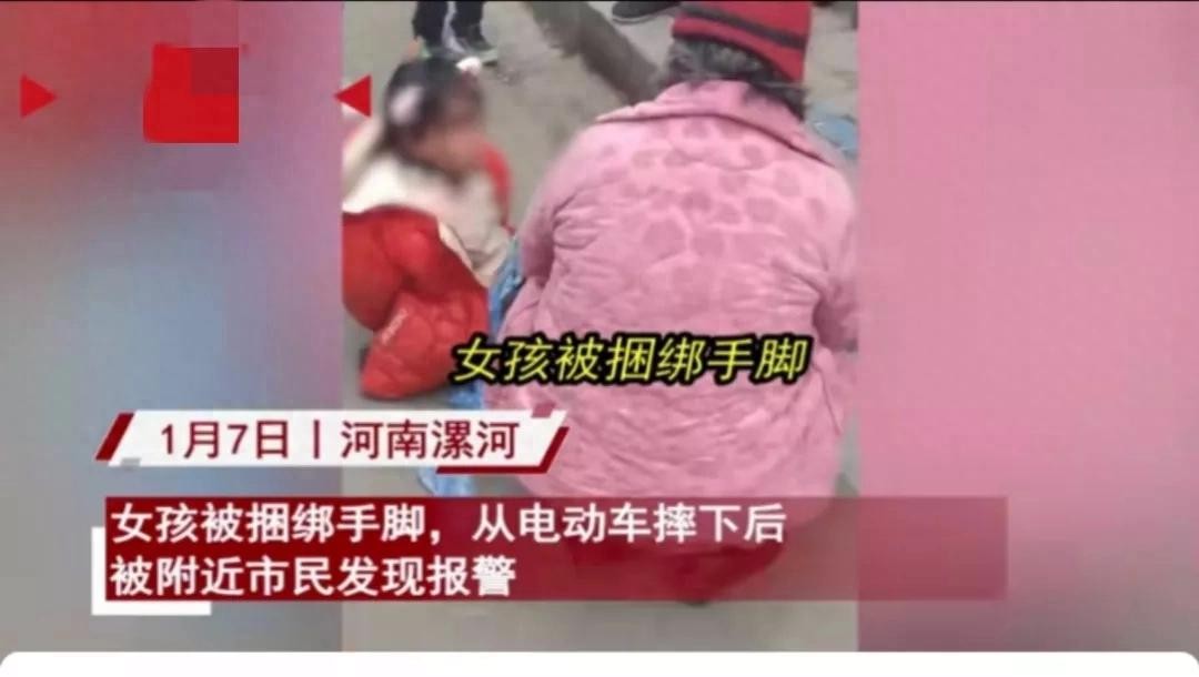 2024年1月8日,有网友在社交媒体上传了一段视频,视频中的事情发生在河南漯河街头,一名身穿粉色衣服的大妈骑车将一女童捆绑放在电动车后座,女孩挣脱后想跑,被大妈按倒在地,随后吸引大量围观群众,有市民报警。