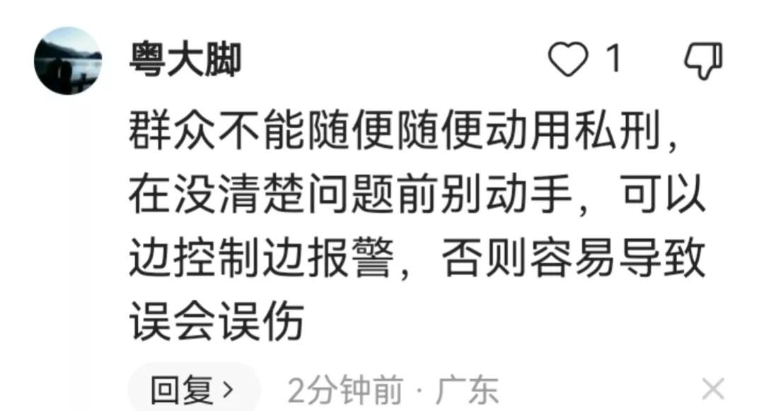 一位来自广东的网友在评论区留言:“群众不能随便随便动用私刑,在没清楚问题前别动手,可以边控制边报警,否则容易导致误会误伤!”