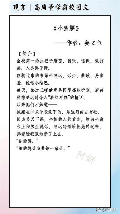 今天给大家推荐的是:3本高质量学霸校园小甜文!校园文里校霸男主还是学霸男主,都让人难以抵抗,没遇到你之前,冷漠,痞帅清冷禁欲系,乖戾不羁,可遇见女主后,妥妥的宠妻小达人,我有千般不驯,只为你妥协。校园小甜文,满满的青春恋爱氛围,一脸姨母笑。