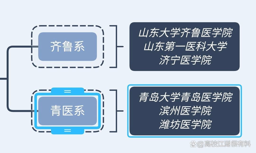 如果将山东的这六大医学院划个阵营的话,那么应该是山东西部的齐鲁系,山东大学齐鲁医学院,山东第一医科大学,济宁医学院;山东东部的青医系,青岛大学青岛医学院,滨州医学院,潍坊医学院。据说滨州医学院曾经计划更名山东第二医科大学,看起来就更工整了。