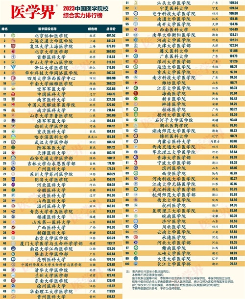 根据医学界发布的2023中国医学院校综合实力排行榜,山东大学齐鲁医学院排名全国第16位,青岛大学医学院排名全国第34位,山东第一医科大学排名全国第36位,潍坊医学院第66位,滨州医学院第82位,济宁医学院第92位。