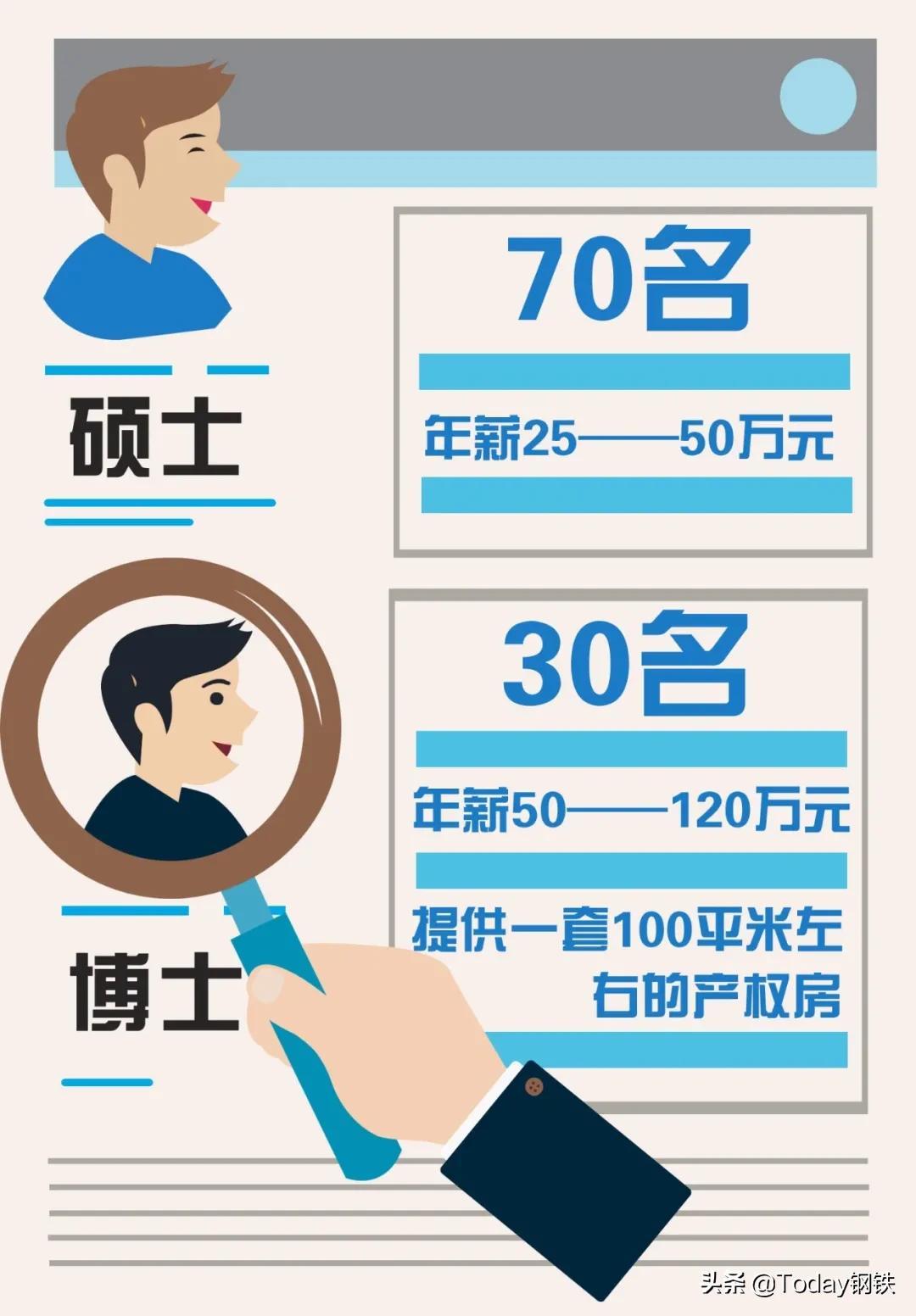 同时,企业今年还将投入3亿元启动的百名硕博人才引智计划,在企业管理、智能制造信息化、生产管理、设备管理4大类30余个岗位招聘高端硕博人才,其中硕士年薪25-50万元,博士年薪50-120万元并额外提供一套约百平米产权住房。