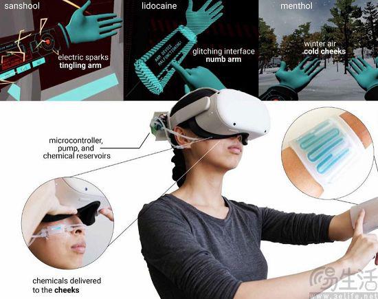 在增强触觉方面,现阶段同样也是通过额外增加传感器及组建来实现,例如 Meta 此前公布的触觉手套、bHaptics 推出的游戏触觉背心等,都是通过大量布置传感器及组件来使用户感觉像在触摸真实的物体。此外也有厂商推出基于化学物质的化学触觉技术,以及基于错觉而产生的 " 伪触感 "。