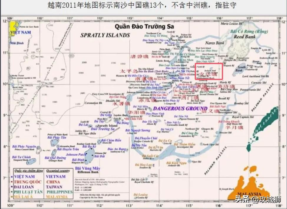 第四个佐证:越南2011年出版了南沙群岛地图,上面标注我国南沙岛礁总共13个,上面就含有安达礁。