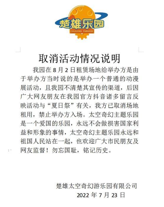 7 月 23 日,楚雄一主题乐园发布声明称:我园在 8 月 2 日租赁场地给举办方是由于举办方当时说的是举办一个普通的动漫展活动,且我园不清楚其宣传的渠道,后因广大网友朋友在我园官方抖音诸多留言反映活动与 " 夏日祭 " 有关,我方已取消场地租用,禁止举办方入场。