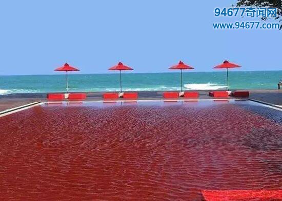 泳池血红色的效果并不是将水染色而成,所以不必担心会有皮肤被染红的风险。它的颜色来自于池壁红色,黄色和橙色瓷砖的组合视觉效果。