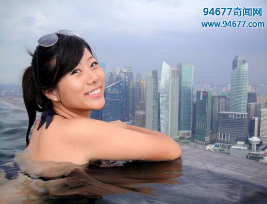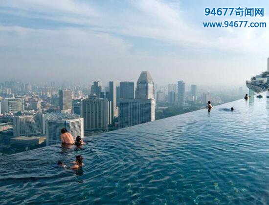 世界上最高的游泳池,位于空中花园的空中游泳池,全长150米,距离地面200多米高,是全球最大的空中室外无边际游泳池。游泳池的边缘看似无任何遮挡,就像瀑布的边际一样,与远处高楼大厦的景致溶为一体,看似危险,却显浪漫。犹如悬于崖边。乍看上去,游泳池仿佛浮在空中没有边界,在里面畅游的人似乎一不留神,就会从200米高空跌落。而池水仿若悬崖边上一汪清泉,“泉水”逐渐向地平线蔓延。“水天相接”处,仿佛一道瀑布飞流直下。这个游泳池不止是最高,还是世界最可怕游泳池之一!