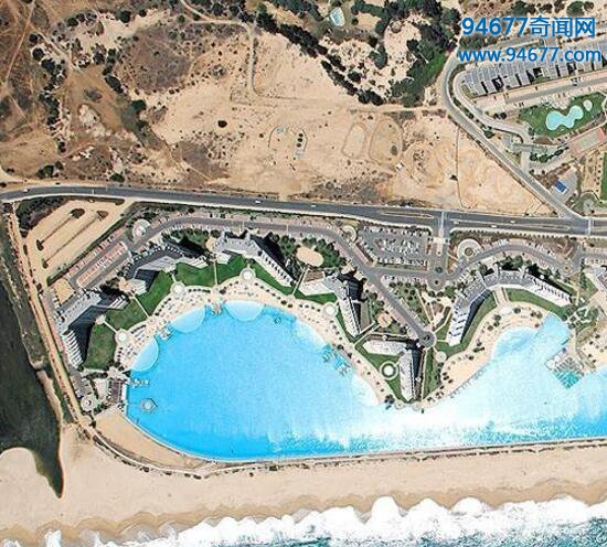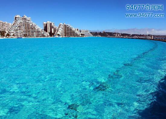 智利阿尔加罗沃的度假胜地,圣阿方索德尔马度假酒店有一个世界最大的泳池,它长1013米,总面积达8万平方米,相当于11个足球场这么大,而池水最深处则为35.05米,可容纳250000立方米的水,游客甚至可以在里面泛舟。已被载入吉尼斯世界纪录。建造这座游泳池花费了5年时间,耗资近10亿英镑,每年的维护费用则高达200万英镑。游泳池内的绿宝石色海水显得极其清澈,以至于池中最深处的水底景象也能被人们看得一清二楚。