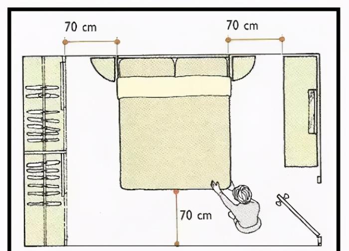 这种床头摆放方式对卧室中的主要"活动区"的影响较小,也是最理想的床头摆放方式。