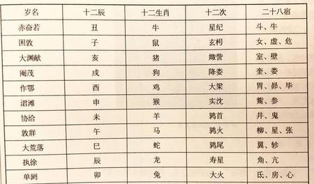 《尔雅.释天》云:“太岁在寅曰摄提格,在卯曰单阏,在辰曰执徐,在巳曰大荒落,在午曰敦牂,在未曰协洽,在申曰涒滩,在酉曰作噩,在成曰茂,在戌曰阉茂,在亥曰大渊献,在子曰困敦,在丑曰赤奋若。”