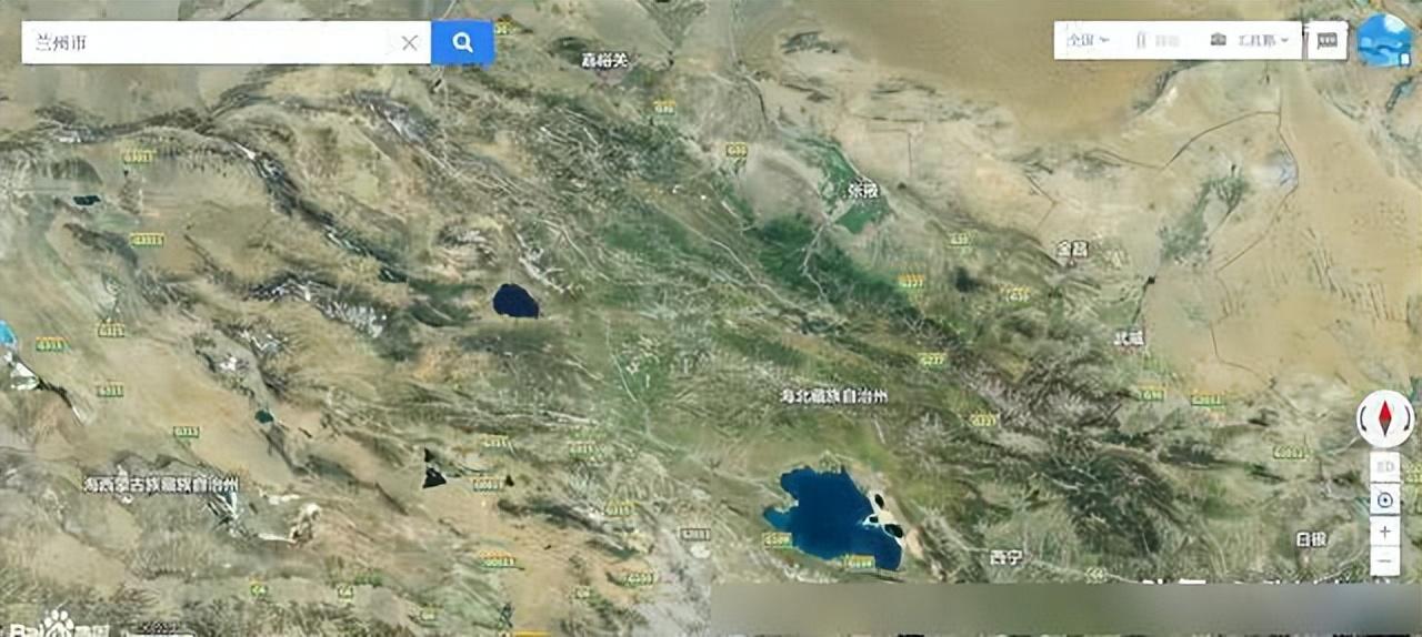 在下方的甘肃中东部地区以及青海省(明显的标志青海湖)与上方的河西走廊之间有一个深颜色凸起的山脉,那就是深入干旱戈壁的祁连山脉。