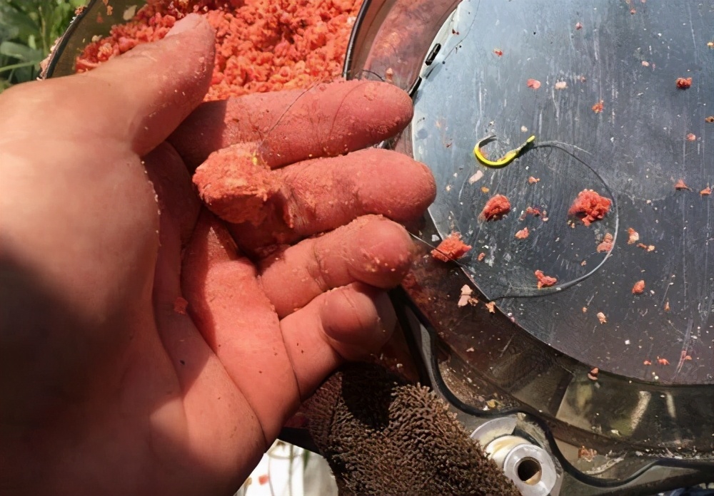 那么我们这时候在把饵料放在开饵盆边缘搓揉几下,减缓饵料雾化状态,让饵料在钩子上留的更久一点。