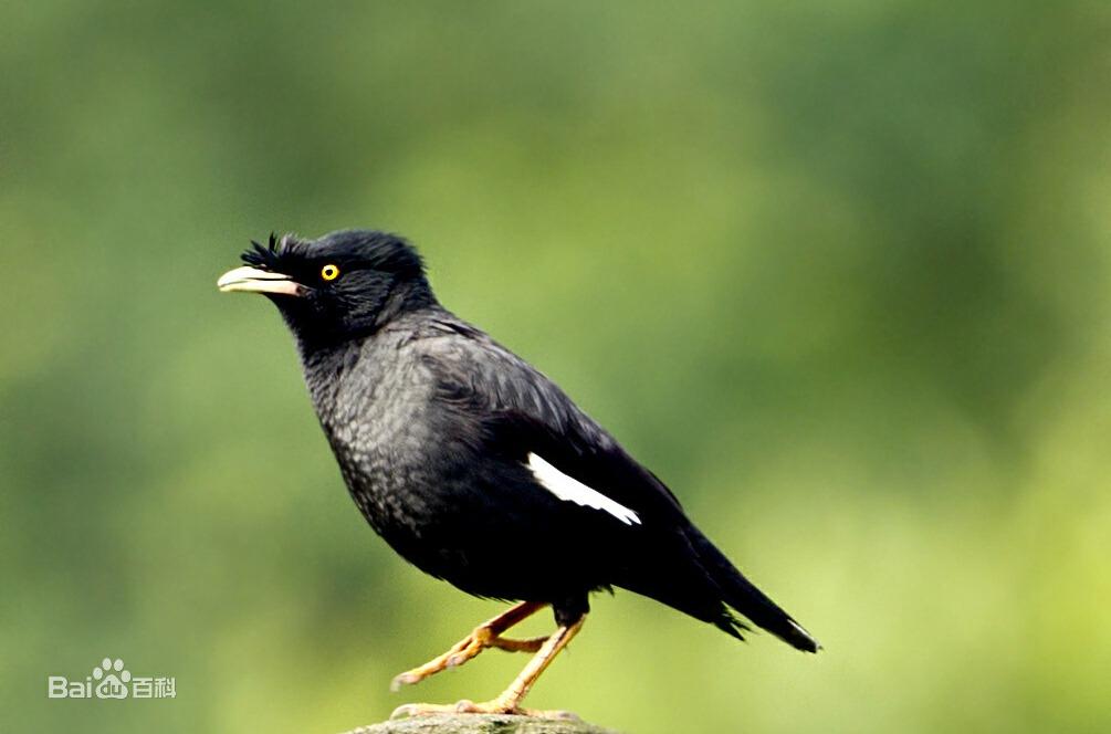 八哥在中国南方的种群数量较普遍,既是重要的农林益鸟,也是颇受欢迎的笼养鸟。它能模仿其他鸟的鸣叫,也能模仿简单的人语,在国内广被人们笼养。外形大小和家八哥相似,体长23-28cm。通体黑色,前额有长而竖直的羽簇,有如冠状,翅具白色翅斑,飞翔时尤为明显。尾羽和尾下覆羽具白色端斑。嘴乳黄色,脚黄色。八哥喜欢在我们学校四号教工楼(怀远楼)楼顶活动,如果你站在教学楼三楼就会看到它们。