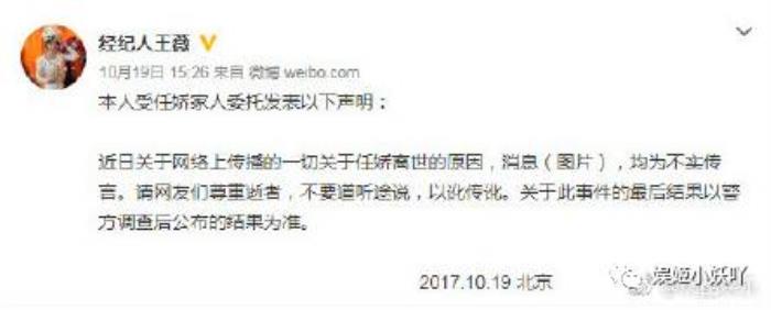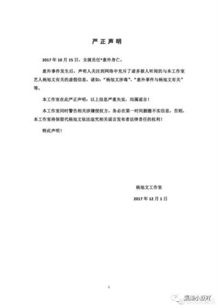 杨旭文工作室也发表声明辟谣任娇死亡与杨旭文并无关系,保留对于此事造谣者追究的权利。