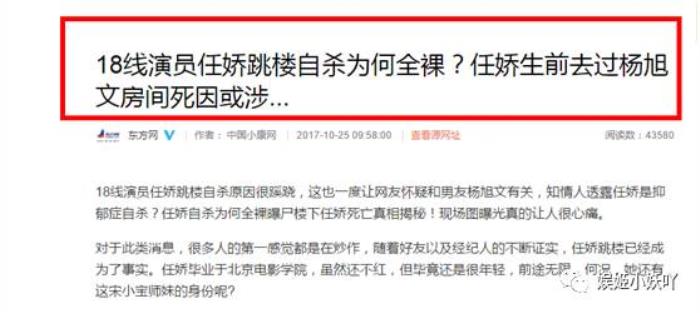 去年年底,“女演员任娇裸体坠楼”一事曾闹的沸沸扬扬,关于其原因猜测也各有说法,但当时有视频显示任娇是裸体走出杨旭文房间后坠楼身亡,杨旭文一时被推上了风口浪尖。在经过警方调查后已排除他杀,杨旭文也发表声明说原因与自己无关,将对不实报道追究法律责任。