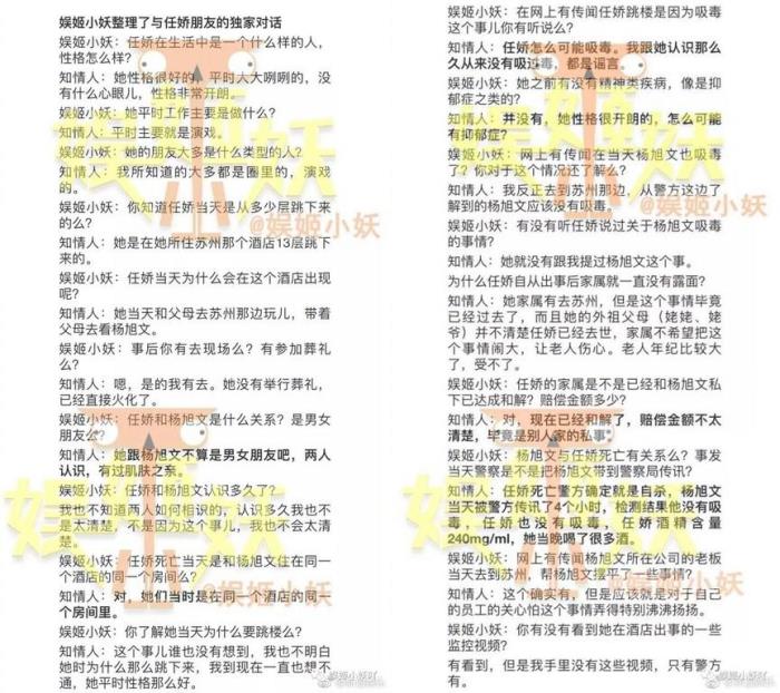 据八卦微博《娱姬小妖》爆料,一名知名人士透露任娇和杨旭文的关系,“不算是男女朋友吧,两人认识,有过肌肤之亲”,对于两人来往细节并不清楚,但是确定女方跳楼前,和男方是在同一个饭店的同一个房间。