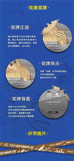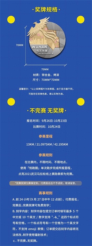 健康跑13km、半程马拉松21.0975km、全程马拉松42.195km。选手需完成所报项目里程,并打开悦跑圈APP记录运动里程数。比赛时间:10月24日00:00—23:59比赛奖励:所有完赛的跑友,除了获得2025汉马直通名额的抽奖资格,还将获得专属完赛奖牌。