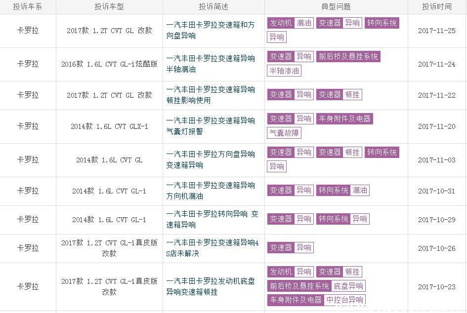 那么卡罗拉变速箱异响的问题到底有多严重呢?很多车主都到相关平台进行了问题的投诉,以下是其中一个平台——车质网车主对变速箱的投诉列表。这个就是为什么买了卡罗拉会后悔了的原因吧!