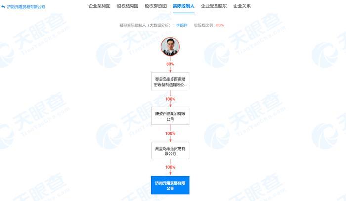 据天眼查显示,济南元隆贸易有限公司成立于2016年6月21日,注册资本为40万元,曾巧娜担任法人,秦皇岛康逸贸易有限公司占股100%,而实际控制人为李银祥,最终受益股份为80%。