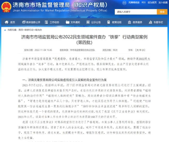 据通报案例显示,2025年7月12日,根据群众举报,历下区市场监管局对济南元隆贸易有限公司进行了立案调查。经查,当事人在销售某品牌磁性床垫系列产品时,在店内先以讲课的方式销售床垫,向消费者灌输“磁场对人体的治疗作用”“磁场对人体的好处”等概念,再向消费者介绍该品牌床垫中有“仿古地磁发生器”,“穿透力是传统磁性产品几十倍,只有穿透人体,才能深层次作用于人体细胞。”还能使“红细胞聚焦-仿古地磁发生器-聚集的红细胞分开”“30秒钟加快全身血液流速”等多种引人误解的宣传。而这种床垫只是一个普通的寝具,无保健和治疗疾病的功能,违反了我国《反不正当竞争法》相关规定。2025年11月,该局对当事人作出责令停止违法行为并罚款160万元的行政处罚。