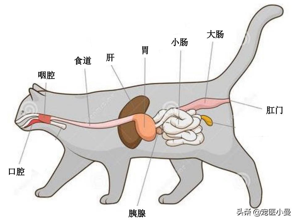首先我们来快速浏览一下猫的消化系统,和人一样,猫的消化系统也是由消化道和消化腺两大部分组成。