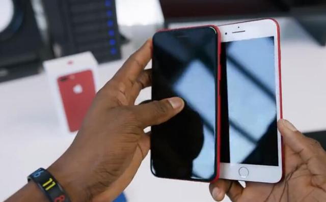 带上红色手机壳的黑色iPhone 7 和红色版iPhone 7 对比