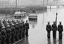 △ 1956年10月1日,时任国防部长彭德怀在杨成武的陪同下,雨中阅兵。