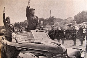 △朱德总司令在聂荣臻陪同下,乘阅兵车检阅部队