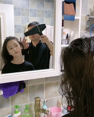 洗完头之后,爸爸还非常温柔地帮女儿吹干头发,平时男人在做这种小事情的时候会很没有耐心,但裴佳欣的爸爸不一样,他很爱自己的女儿,女儿可是自己的小情人呀,在给女儿吹长发的时候爸爸非常有耐心。但是当裴佳欣妈妈帮女儿洗头的时候,画风突变,有的时候母爱如山体滑坡呀。