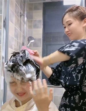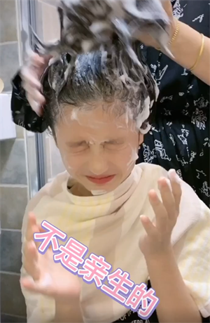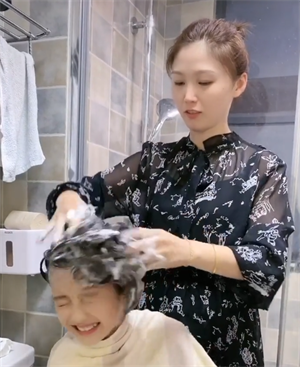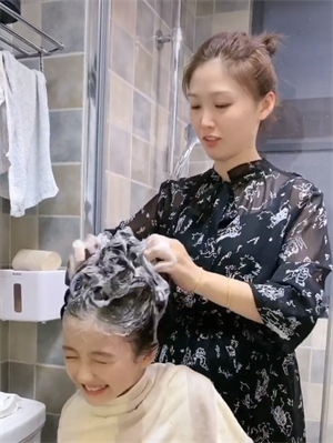 妈妈给裴佳欣洗头的时候是坐着洗的,裴佳欣在脖子上围着一个粉红色的毛巾,一般干洗都是坐着洗的,但是裴佳欣的妈妈显然不想帮女儿干洗,妈妈给裴佳欣的头上揉搓出了大量的泡沫,而这些泡沫都沾到了裴佳欣的脸上,甚至进了眼睛里面。到了冲洗环节妈妈直接挖了一瓢水倒在了裴佳欣的头上,当水和泡沫顺着裴佳欣的脖子一直流时,网友都觉得这画面也太狼狈了。
