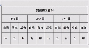 比如,以甲班为例:1日早8点接班,上白班12小时,当日晚8点下班;休息6小时之后,2日凌晨2点接班,上班6小时,当日早8点交班;休息12小时之后,当日晚8点接班,上班6小时,3日凌晨2点交班。一个工作流程结束,休息30小时后,于4日早8点继续接班上白班。